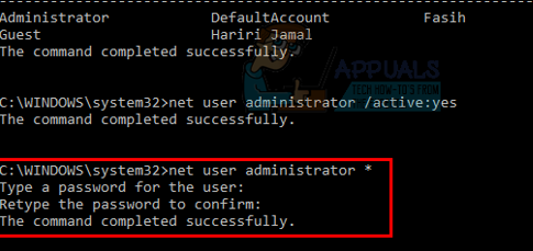 - Type net user administrator * and press Enter. You will be asked twice to enter the password that you want to set for the administrator account. Just type your password and press Enter.