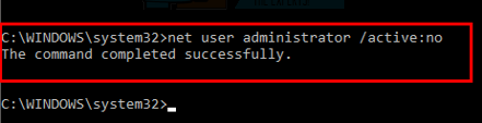 - Type net user administrator /active:no and press Enter.