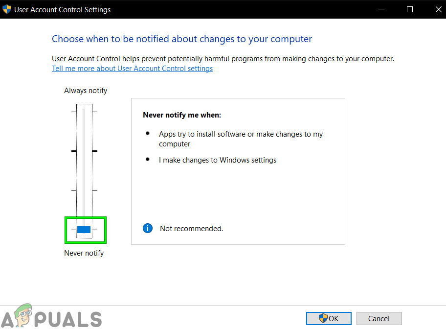 Open UserAccountControlSettings - Now in the User Account Control Settings window, adjust the slider to Never Notify and then click OK.