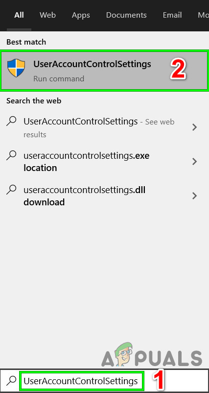 - Press the Windows key, type UserAccountControlSettings and in the results, click on UserAccountControlSettings.