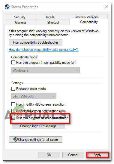 Accessing the Properties screen of Steam - Inside the Properties screen of Steam, access the Compatibility tab, go to the Settings menu and check the box associated with Run this program as an administrator. Then hit Apply to save the change.