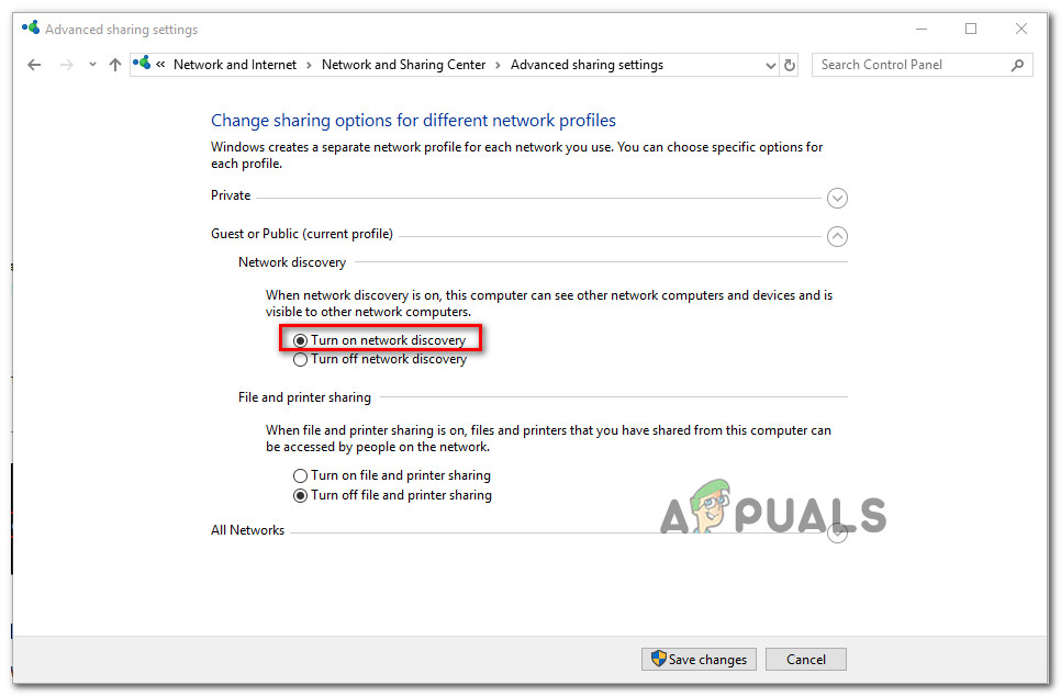 Note: If you’re encountering the issue on a PC, it’s a good idea to enable Network Discovery from your Windows settings. Some users encountering the same issue have reported that turning on network discovery is what finally did the trick. To do this, open a Run box (Windows key + R), type “control.exe /name Microsoft.NetworkAndSharingCenter” and press Enter to open the Network and Sharing Center. Once you get there, go to Chance Advanced sharing settings and enable the toggle associated with Turn on network discovery (under Network discovery)