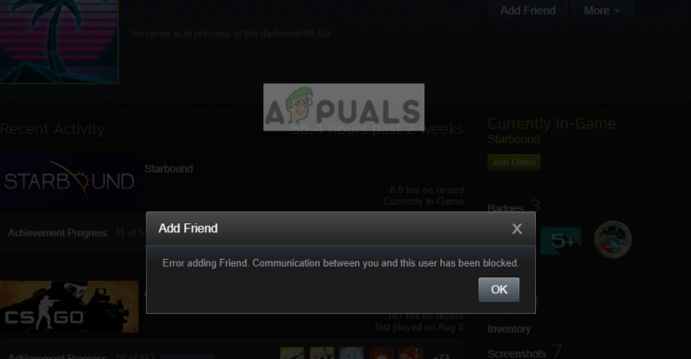 Steam features a blocking mechanism that you can use to block several people from contacting you or seeing your activity. The opponent account either becomes invisible to you or there is no information about that account (only profile picture is displayed). If you are trying to add a friend who is on your block list, you will not be able to do so. Whoever is in your block list is barred from communicating with you (which includes adding friends). We will go navigate to your Steam’s block list and check.