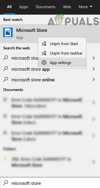 - If the issue persists, press the Windows key and type: Microsoft Store. Now, in the results, right-click on Microsoft Store, and in the mini-menu, choose App Settings.