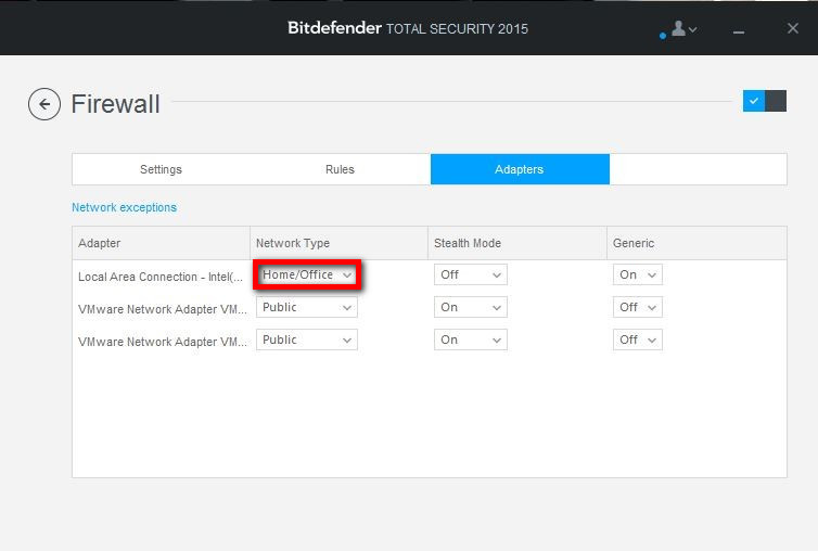 To do this, open BitDefender, go to AV settings and click on the Adapters tab. Then, use the drop-down menu associated with your Local Area Connection to change the Network Type to Trusted.