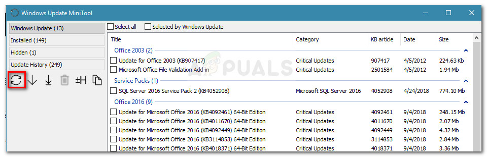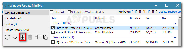 Note: Keep in mind that the Windows Update MiniTool is exponentially slower than the built-in WU. Be patient and don’t close the WUMT window until the search results are returned. - Select the update that you want to apply by checking the icon related to it and press the download and install icon.