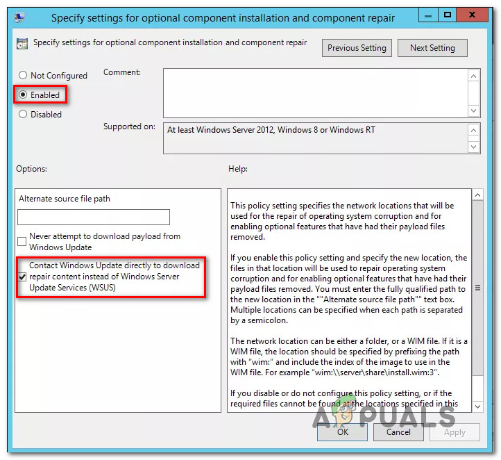 - Group policy is preventing the installation – There’s one policy that has the potential of triggering this particular error if it’s disabled from the Local Group Policy Editor. If this scenario is applicable, you can resolve the issue by enabling the ‘Specify settings for optional component installation and component repair’ policy.