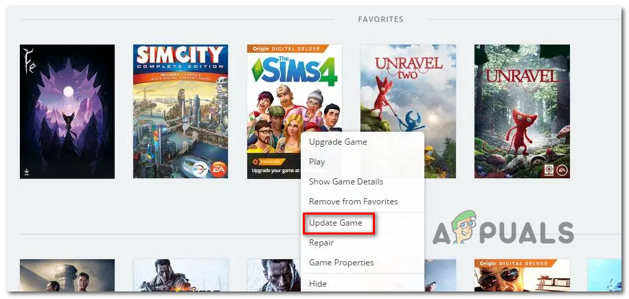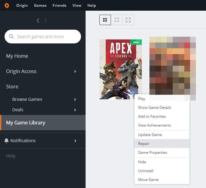 - After you have successfully gotten rid of the localthumbcache.package file, open Origin, right-click on Sims 4 game (under Library), and choose Repair game from the context menu.