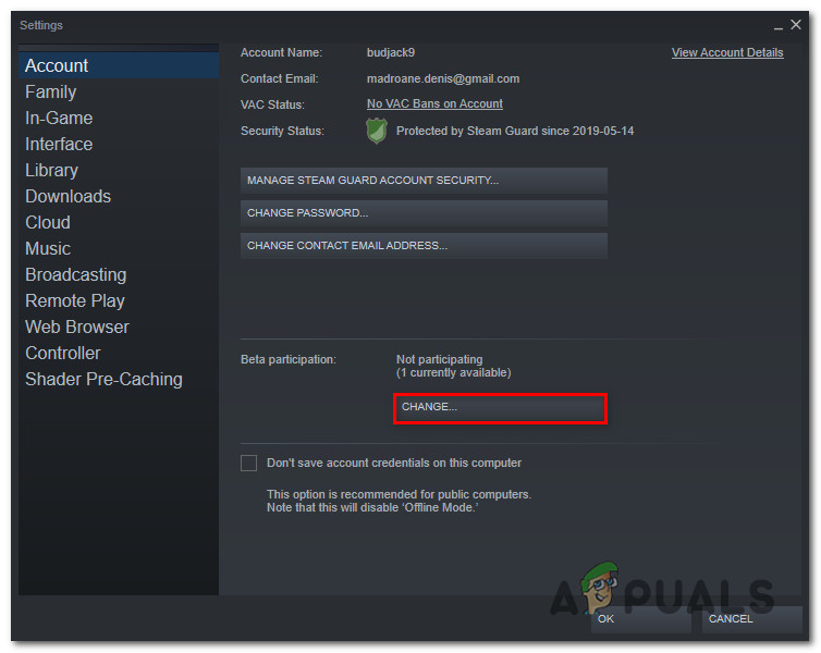 Go to Steam and click on Settings - Once you’re inside the Settings menu of Steam, click on Account from the vertical menu on the left, then click on the Change button associated with Beta participation.