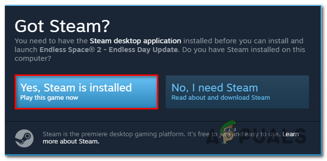 - When prompted by the next action pop-up, click on ‘Yes, I have Steam installed‘ in order to make the action you just undertook to reflect in your local Steam installation.