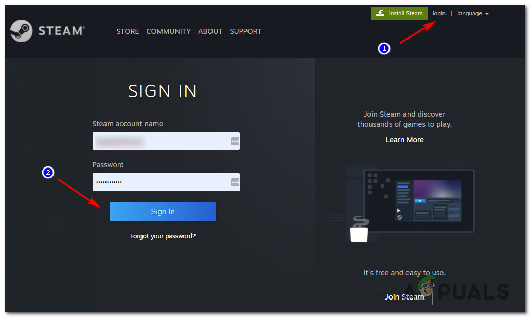 - Open your browser and navigate to the web Store version of Steam. Once inside, click on Login and insert your user credentials before clicking on the Sign In button.