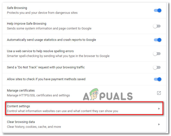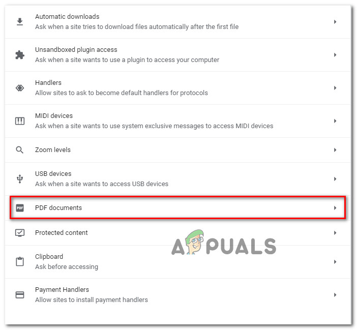 Accessing the Content Settings menu of Google Chrome - Scroll down through the list of Content settings list and click on PDF documents. Inside the next menu, enable the toggle associated with Download PDF files instead of automatically opening them in Chrome.