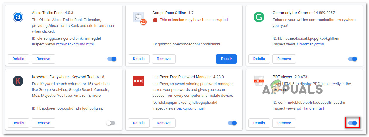 Verifying if the newly installed extension is enabled - Restart Google Chrome, open another PDF file and see if the Error Failed to Load PDF Document issue is still occurring.
