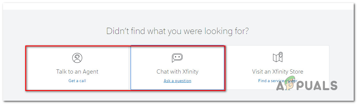 The quickest way to resolve this issue, in this case, is to reach out to the support team of Xfinity. You can do this by using this link (here) and choosing one of the available contact methods – Talk to an Agent or Chat with Xfinity.