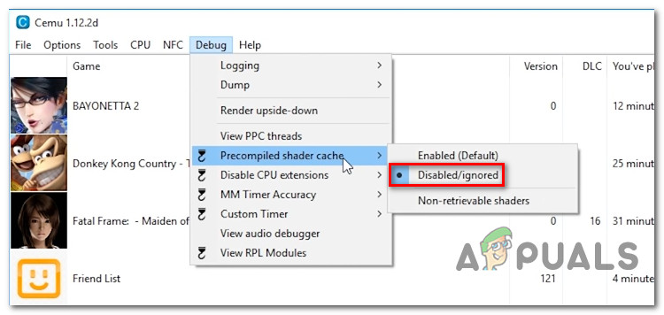 - Open CEMU emulator and use the ribbon menu at the top to access the Debug menu, then click on Precompiled shader cache and set it to Disabled / Ignored.