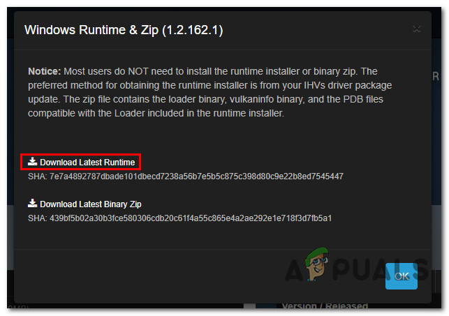 - When you arrive at the correct location, click on the Windows icon inside the download button, then scroll down to the Windows section and click on the Latest Runtime/ZIp hyperlink to download the latest version of the Vulkan environment.