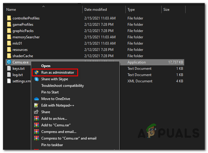 - Once the extraction process is complete, navigate to the location where you extracted the latest version of Cemu, right-click on Cemu.exe and choose Run as Administrator from the context menu.