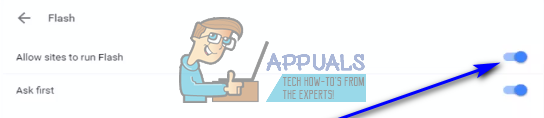 - The Allow sites to run Flash option will have a toggle next to it – you need to make sure that it is toggled on. If this option is, for some reason, toggled off, simply click on the toggle to enable the option.
