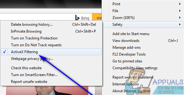 - If there is a check next to the ActiveX Filtering option, simply click on the option and the check will disappear, effectively disabling ActiveX Filtering.