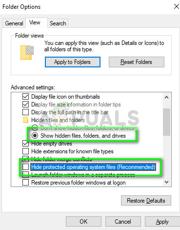 - Select the tab View and check the option Show hidden files, folders, and drives. Also, uncheck the option Hide protected operating system files (Recommended).