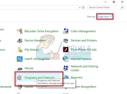 - Once in the control panel, select the option “View by Large icons” present at the top right side of the screen and select the subcategory “Programs and Features”.