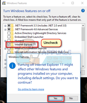 Turn Windows Features on or off - Uncheck the feature “Internet Explorer 11”. A UAC will pop up asking you to confirm your actions. Press “Ok” and restart your computer.