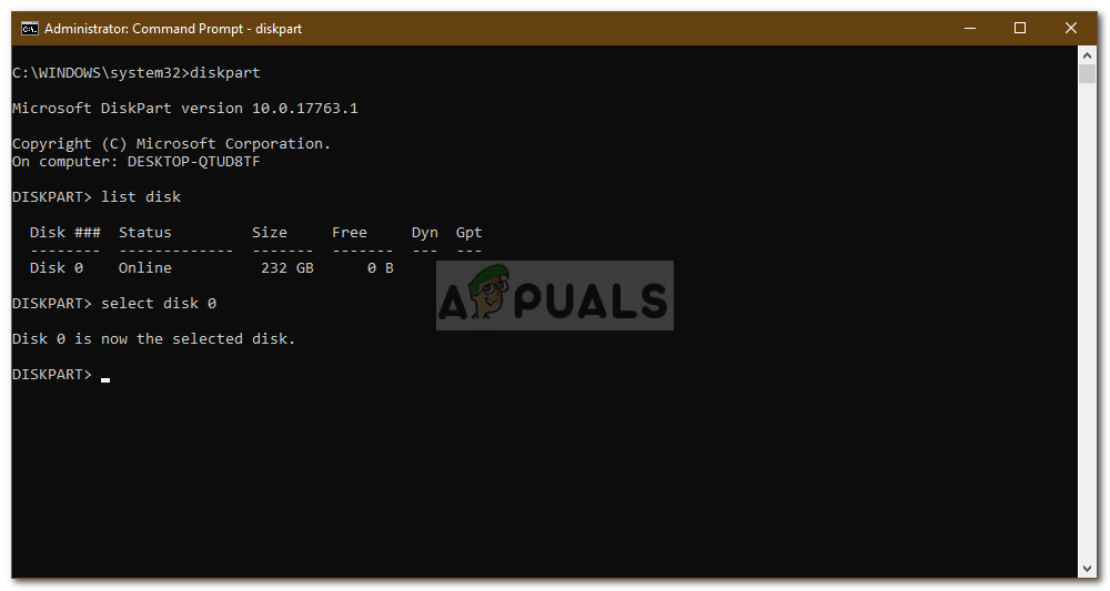 - Once diskpart opens up, type in ‘list disk’ and then type ‘select disk X’ to select your disk. Please note that X is the disk number.