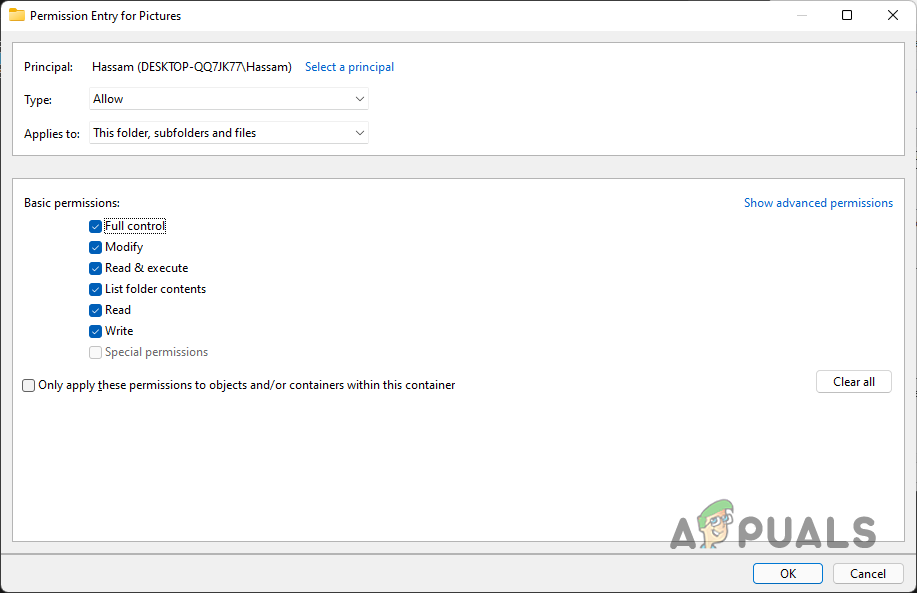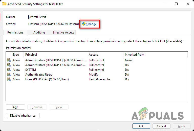 Taking Ownership of the File - Then, click Apply and then click OK.