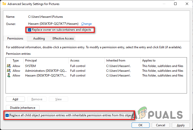 - Now that you have done that, check the Replace owner on subcontainers and objects checkbox along with the Replace all child object permission entries with inheritable permission entries from this object checkbox at the bottom left corner.