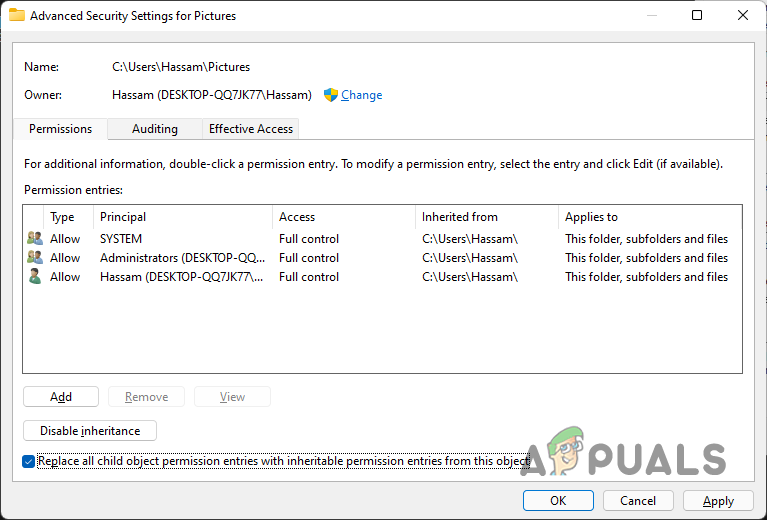 Giving Full Access to User Account - Finally, tick the Replace all child object permission entries with inheritable permission entries from this object checkbox again.