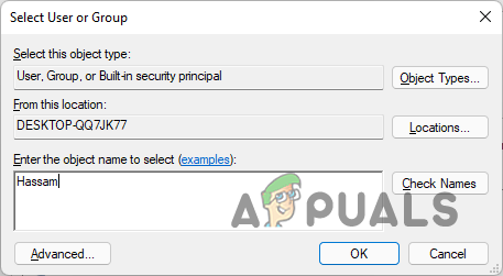 Changing Ownership - Then, enter your user account name in the empty space under the Enter the object name to select text.