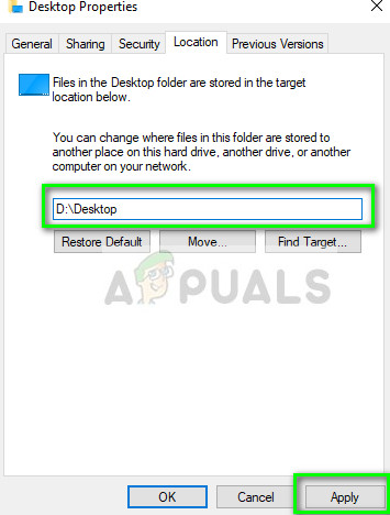 - Select the tab Location, and browse to the path where you created the new folder (in this case, ‘D:\Desktop’. Press Apply.