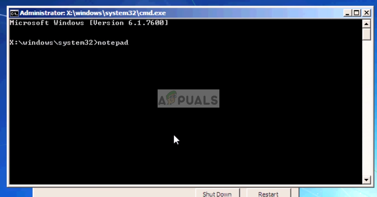 - Open the command prompt in RE (you can use an installation media or enter the RE on your computer). Once in the command prompt, execute the instruction ‘notepad’. This will launch the normal notepad application on your computer in RE environment.
