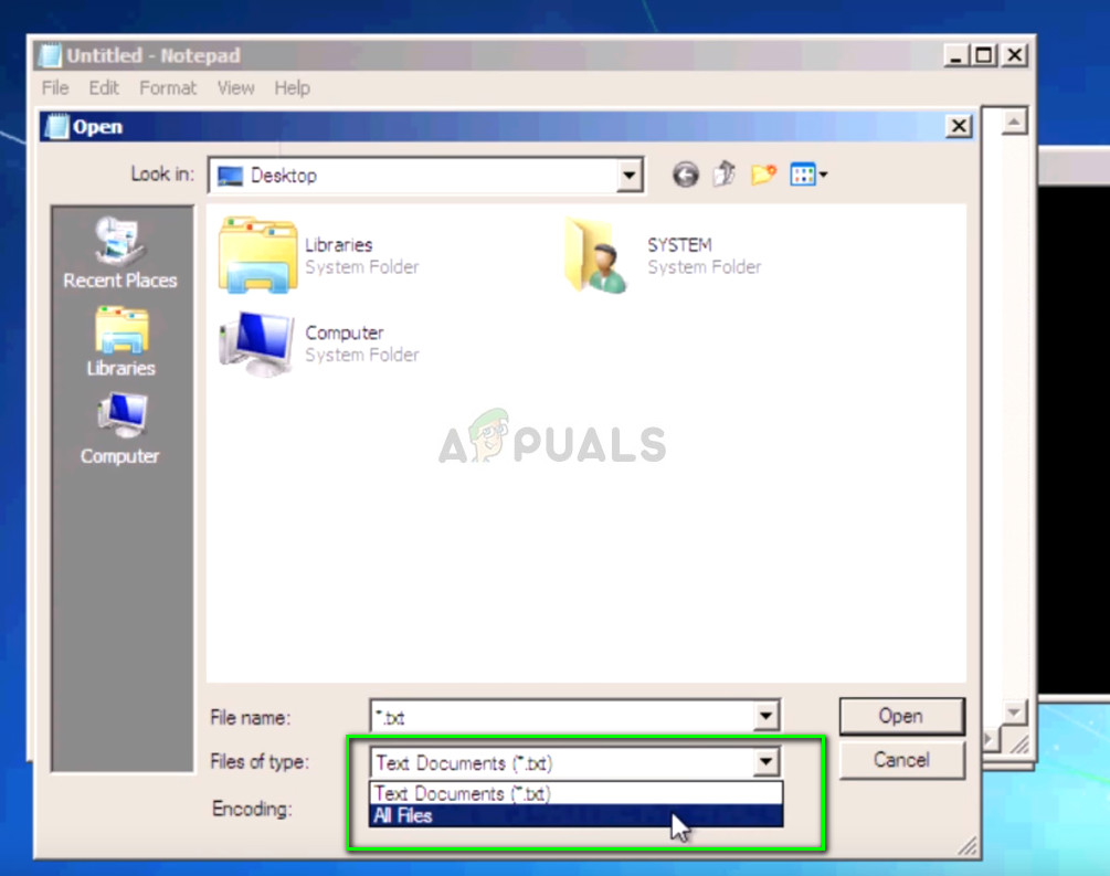 - Press File > Open in the notepad. Now select ‘All Files’ from the option “Files of type”. You will now be able to see all the files on your computer using this explorer.