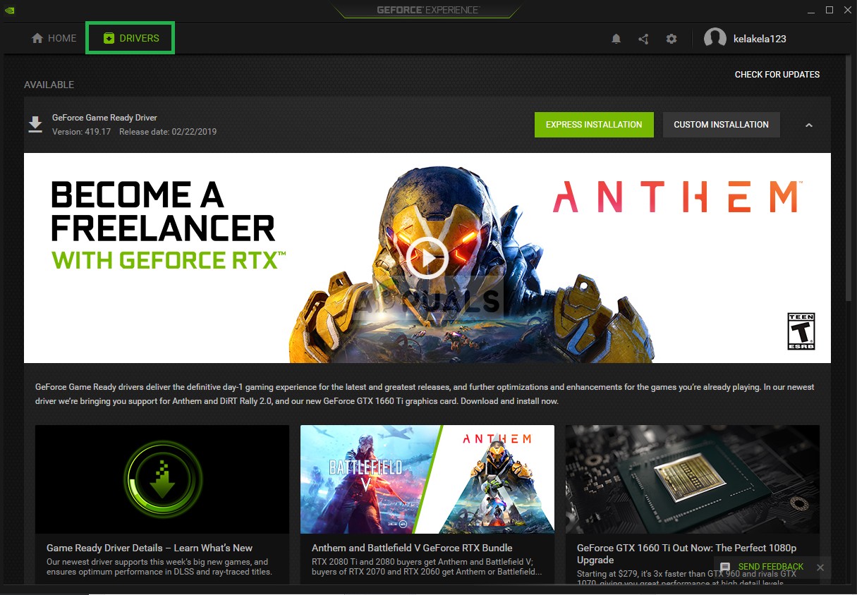 Opening Geforce Experience - After signing in, Click on the “Drivers” option on the top left