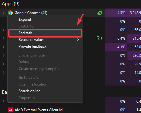 - Right-click the unnecessary running applications and click End Task.