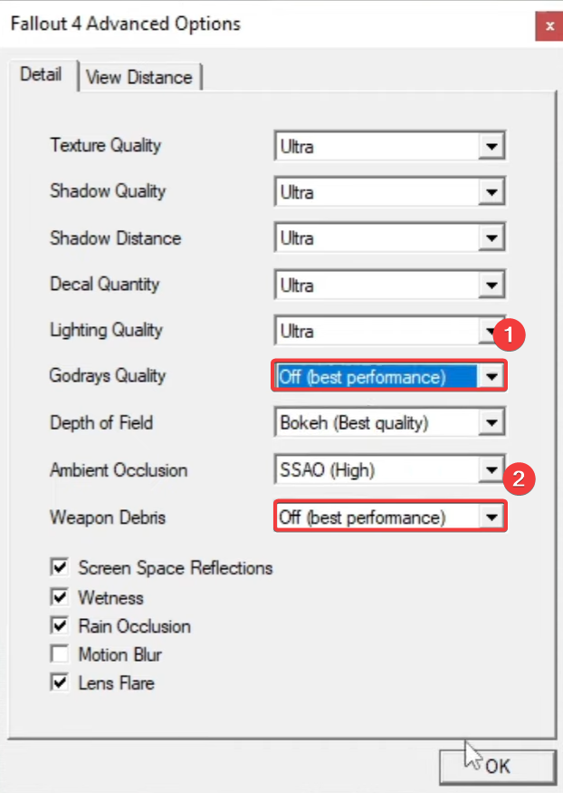 - Click on Advanced and disable both Godrays and Weapon Debris.