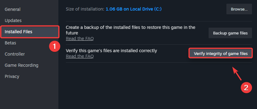 - Navigate to Installed Files on the left pane and click Verify the integrity of game files.