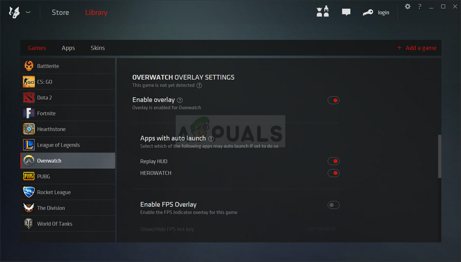 - Navigate to Library >> Games and locate Fallout 4 in the list of games you have installed. Click on it once in the left pane and click the Enable overlay option in order to slide it to the left and disable it.