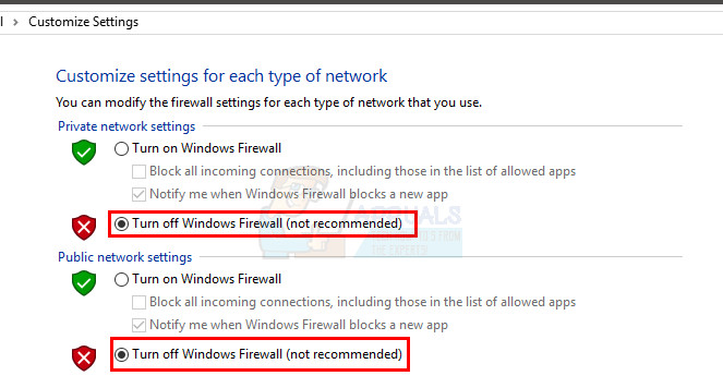 - Select the option Turn off Windows Firewall (not recommended). Select this option in both Public network settings section as well as Private network settings