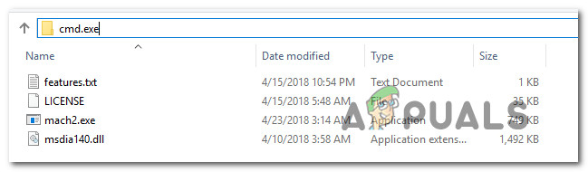 - Navigate to the location of the mach2 folder and type “cmd.exe” in the address bar. This will open a Command Prompt directly in the location that is of interest to us.