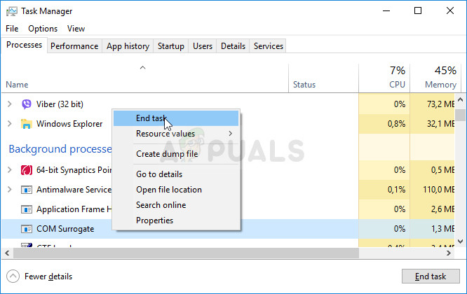 - Click on More details in order to expand the task manager and search for the COM Surrogate entry displayed on the list in the Processes tab of Task Manager. It should be located right under Background processes. Also, try locating and ending the dlhost.exe entries. If you see multiple entries, right-click on all of them and choose the End task option from the context menu which appears.