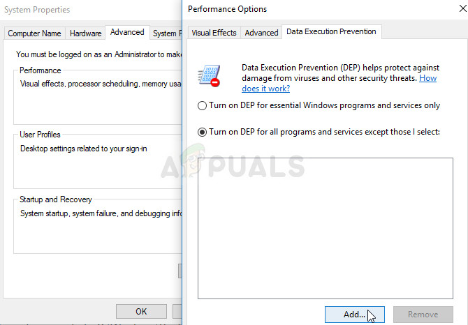 - Performance options will open on your computer and from here you will have to choose Data Execution Prevention. Select the radio button in order to enable “Turn on DEP for all programs and services except those I select” and then click on Add button.