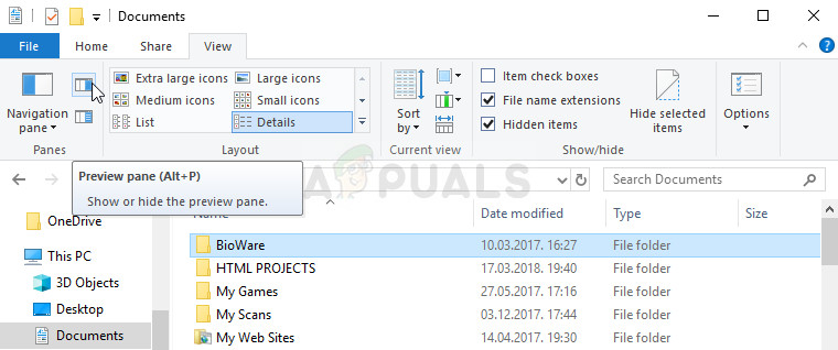 - At the top menu of the folder you chose to open, navigate to the View tab and check under the Panes section right below. Locate the Preview Pane option and disable it. The option and the way of disabling it is different from one version of Windows to another but it’s quite obvious.
