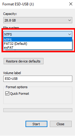 - In the Format window, select ‘NTFS’ or ‘exFAT’ from the ‘File system’ drop-down menu.