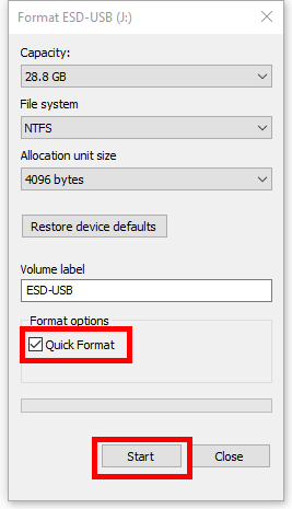 - Click ‘Start’ and wait for the formatting process to complete.