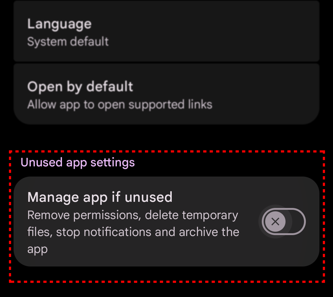 - Scroll down and toggle off Manage app if unused or Pause app activity if unused (the wording may vary depending on your Android version).