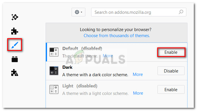 - In the Add-ons Manager, go to the Themes panel an click on the Enable button associated with the Default theme.