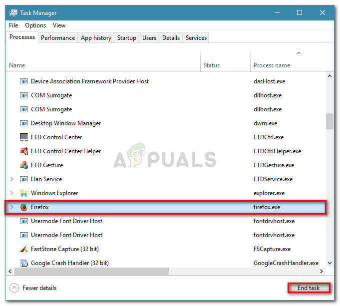If you rarely experience instability, a temporary fix will be to force close Firefox and initiate a restart. If the error is caused by an internal bug or by a corrupted internal file forcing the client to update will resolve most of those errors. Once Mozilla Firefox becomes unresponsive, you won’t be able to close it the conventional way (via the close icon). However, you can easily close the program through Task Manager by pressing Ctrl + Shift + Esc. Then, go to the Processes tab, select Firefox and click the End task button.