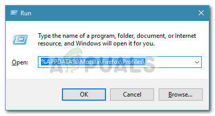 - Press Windows key + R to open up a Run box. Then, type “%APPDATA%\Mozilla\Firefox\Profiles\” and hit Enter to open the folder containing the profile folders of Firefox.